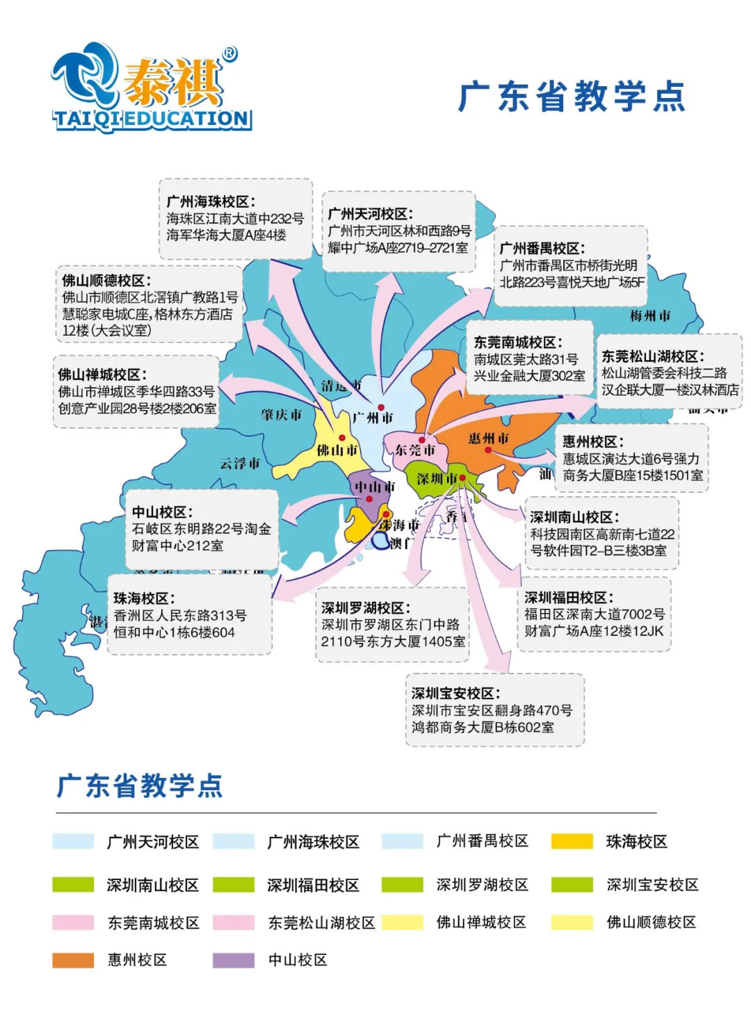 泰祺教育在广东七个城市开设14个直营教学点,有需要的可以联系: